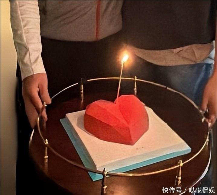 尽管两人只是在家做了简单布置,不过不难看出氛围格外温馨。两人中间放着一个红色的蛋糕,看这造型,想必是为了过情人节特意做成了爱心模样。