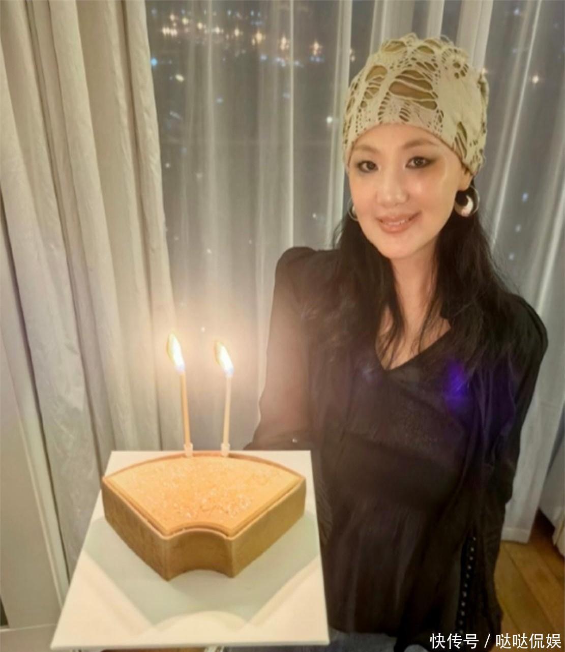 屋内未开灯,蛋糕上的蜡烛映出了咏梅和栾树的身影。照片中,咏梅穿着一件版型稍宽松的黑色上衣,隐隐露出内搭的一角,下身配了条牛仔裤。