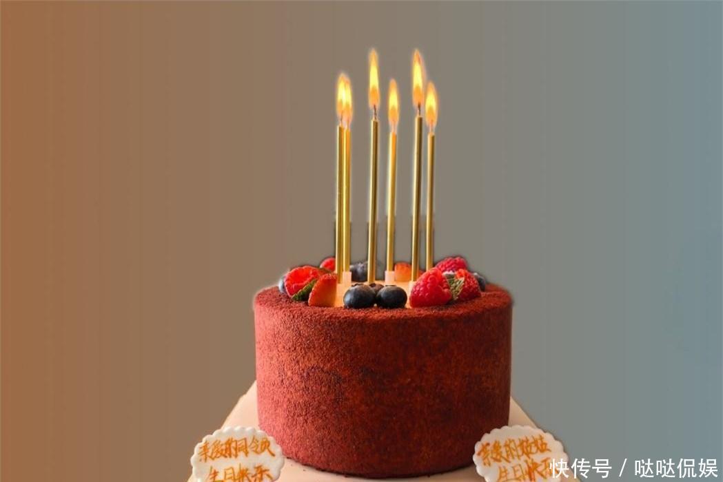 另一个是外观普通的红色蛋糕,上面点缀着蓝莓和草莓,还插了六根蜡烛。不过,这张照片的关键在于下方写有祝福话语的牌子。